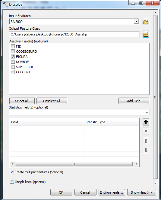 Como capa de entrada (‘Input features’) seleccionamos la que contiene los espacios de la Red Natura 2000 y asignamos un nombre a la nueva capa que se va a generar (‘Output Feature Class’). Como campo a disolver (‘Dissolve Field’) activamos el campo «FIGURA» que es el que nos indica qué tipo de figura de protección es cada registro; una vez seleccionado pulsamos en OK.