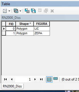 Ahora, si abrimos la tabla de atributos de la nueva capa observaremos que sólo tiene 2 registros, uno por cada tipo de figura de protección: