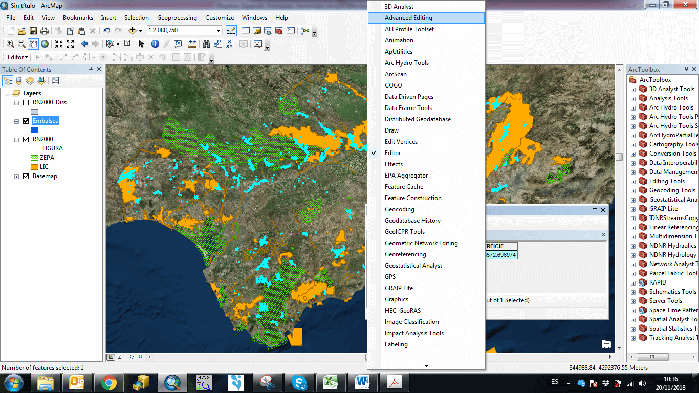 Para separar cada embalse en un registro diferente (en un polígono diferente) usaremos la herramienta Expandir que se encuentra en la barra de tareas de Edición Avanzada de ArcGIS. Para activarla pulsamos en cualquier lugar de la barra superior con el botón derecho y seleccionamos la opción Advanced Editing.