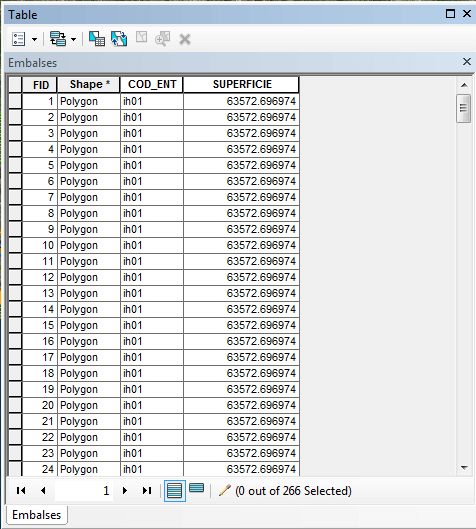 Una vez que pulsemos, al abrir de nuevo la tabla de atributos de la capa de embalses comprobaremos que se nos han generado 266 registros, es decir, un registro por cada una de las entidades vectoriales, en este caso un registro por cada embalse.
