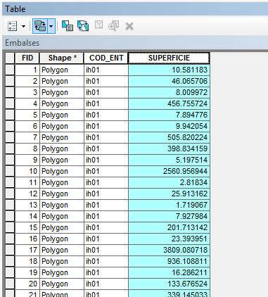 Por último veremos que todos los registros tienen asignada la misma superficie. Esto se debe a que el programa mantiene los mismos campos y datos para cada registro así que para conocer la superficie de cada embalse habrá que realizar el cálculo de geometría.