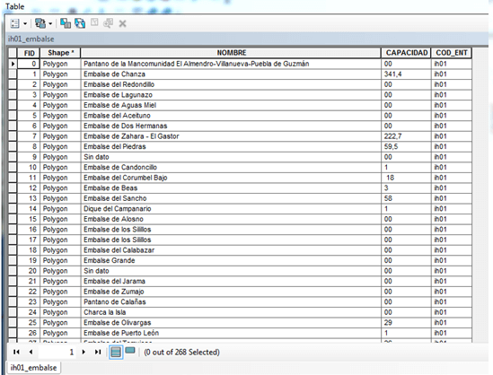 Imaginemos por ejemplo que necesitamos crear un mapa de cada uno de los embalses existentes en la Comunidad Autónoma de Andalucía. Para ello disponemos de una capa que contiene todos los embalses, en este caso 268 registros: