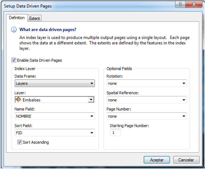 La exportación masiva de mapas siempre se realiza en función de los registros contenidos en un campo, en nuestro caso será el campo “Nombre” de la capa “Embalses” por lo tanto indicamos la capa sobre la que queremos centrar cada elemento del mapa (Layer) y el campo que contiene los registros a exportar (Name Field). También podemos ordenar la manera en la que queremos que se realice la exportación (Sort Field).