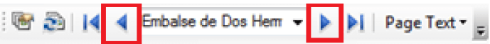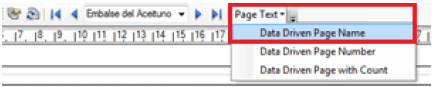 Otra opción interesante que presenta la herramienta es la posibilidad de etiquetar cada mapa con textos que varíen según el elemento que se está visualizando. Por ejemplo vamos a indicar que se muestre en la parte superior central de cada mapa el nombre del embalse. Para ello pulsamos en Page Text y seleccionamos la opción Data Driven Page Name: