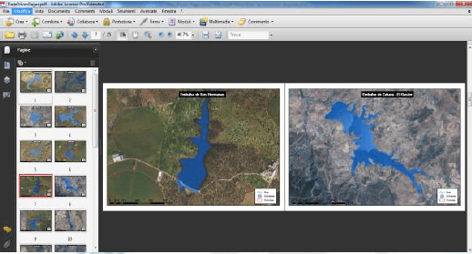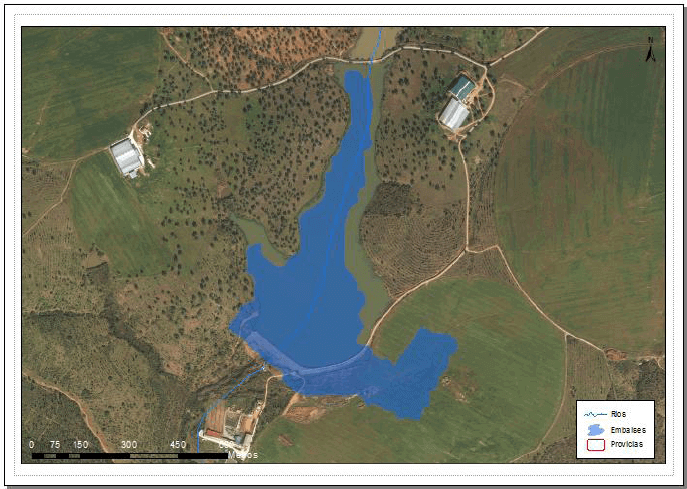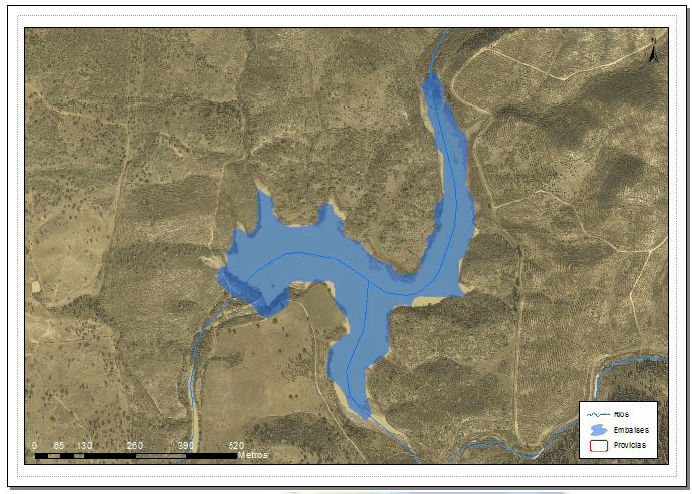 Situamos el cuadro de texto en la posición que queremos que aparezca y configuramos el formato (tipo y tamaño de letra, color del texto, etc…). Ahora si vamos pasando de un mapa a otro comprobaremos que el nombre del embalse irá cambiando.