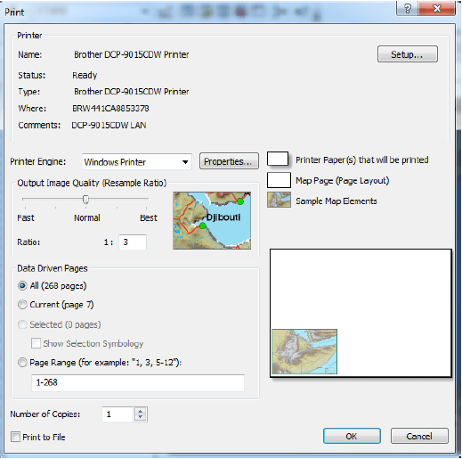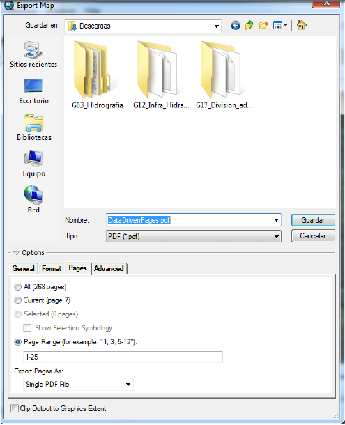 Una vez configurado podemos comenzar a generar nuestros mapas de forma masiva. Para ello podemos imprimir los mapas usando la opción File < Print; en la parte inferior tenemos las opciones para Data Driven Pages: podemos imprimir todas las páginas, solo la actual o marcar un rango concreto.