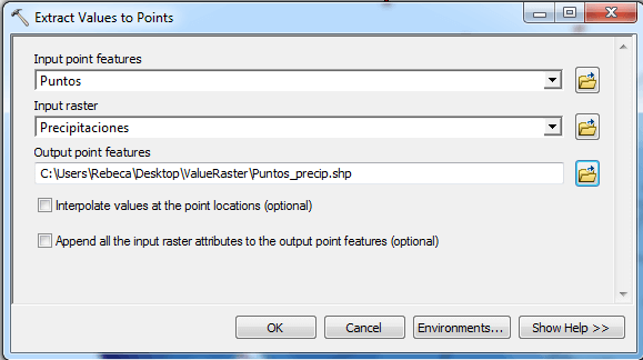 Como capa de puntos de entrada (‘Input point features‘) seleccionamos la que contiene los puntos “Puntos”. Debemos indicar también el raster del que queremos extraer la información (‘Input raster’) que en este caso es el de “Precipitaciones”. Por último debemos establecer una ruta de guardado y un nombre a la capa de salida (‘Output point feature’).