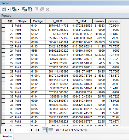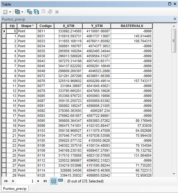 Este campo contiene el valor del raster (en este caso el valor de precipitación media anual en mm) para cada uno de los puntos. En algunos casos el valor obtenido es de -9999 y representa que no existe valor raster para ese punto.