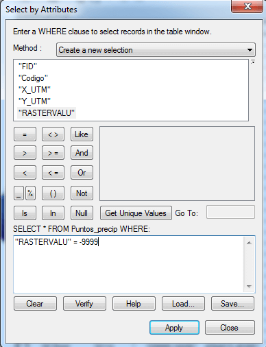 Vamos a realizar una selección por atributos para seleccionar todos los registros de la tabla que contienen valores -9999: