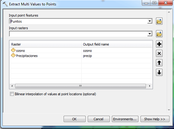 Igual que al extraer valores de un raster, como capa de puntos de entrada (‘Input point features‘) seleccionamos la que contiene los puntos. En esta ocasión el programa nos pide que le indiquemos todos los raster de los que queremos obtener la información (‘Input rasters’) de manera que seleccionamos tanto el raster de precipitaciones como el de ozono:
