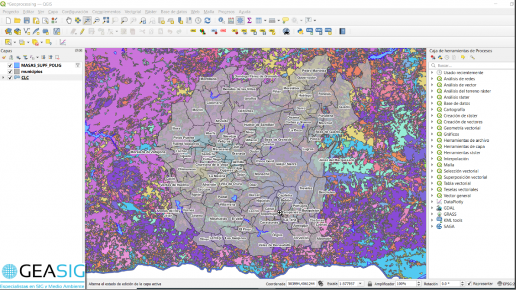 Observamos que la capa de usos de suelo excede los límites de la región de estudio de manera que vamos a realizar un Clip para quedarnos únicamente con los usos de suelo existentes en nuestra zona Vectorial < Herramientas de Geoproceso < Cortar.