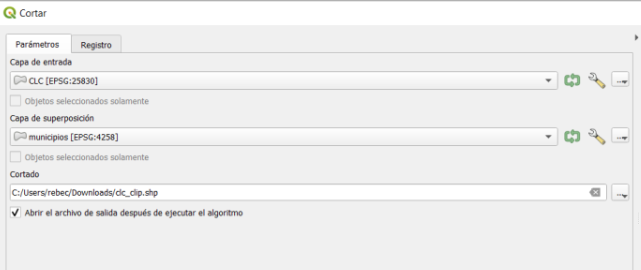 Como capa de entrada fijaremos la que queremos recortar, es decir, la capa del Corine (usos de suelo) y como capa recorte la que delimita el área de estudio «Municipios». Por último asignaremos la ruta de guardado y el nombre a la capa que se va a generar y pulsaremos en ‘Ejecutar’.