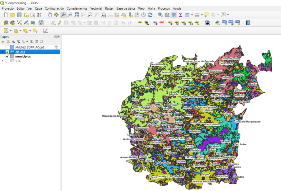 Tras unos segundos obtenemos un nuevo shape con los usos de suelo existentes únicamente en dentro de nuestra capa de municipios: