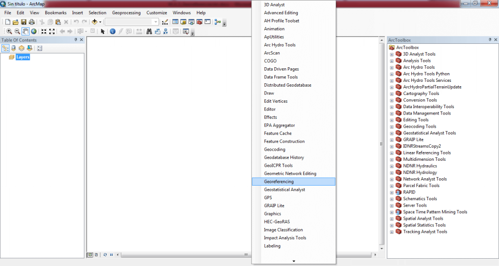 Para comenzar el proceso de georreferenciación, lo primero que debemos hacer es activar la barra de herramientas de georreferenciacion (Georreferencing) Customize < Toolbars < Georreferencing.