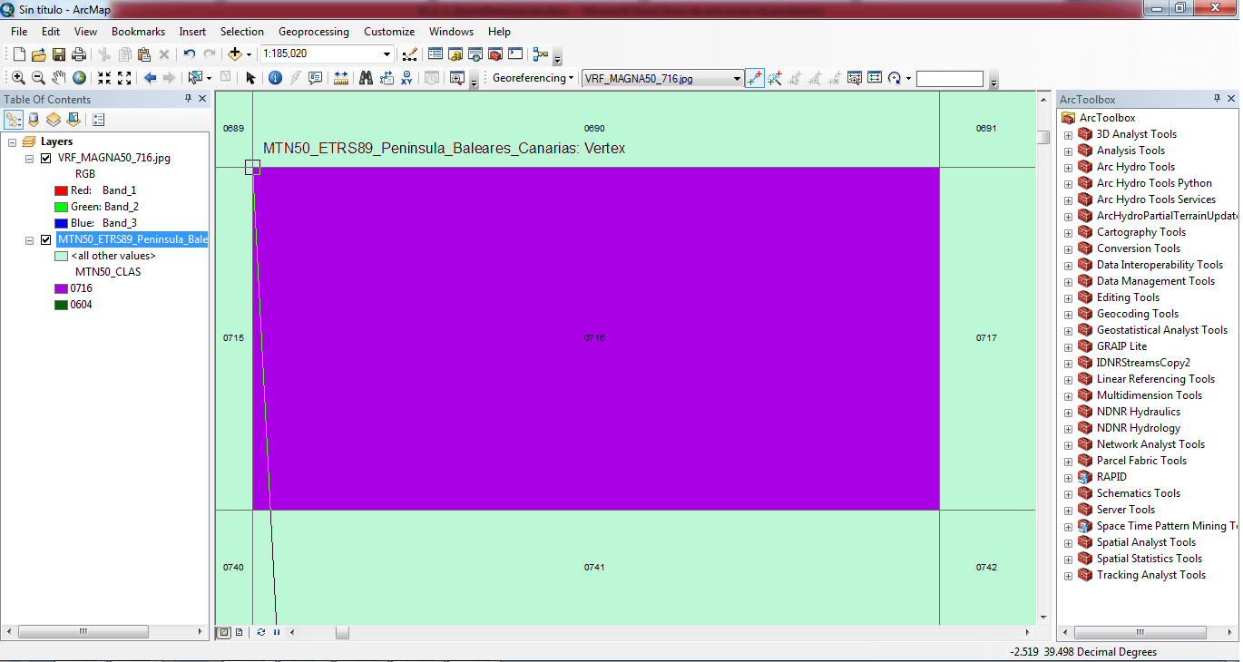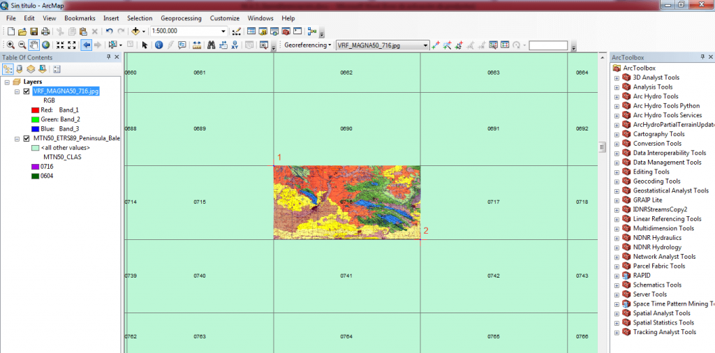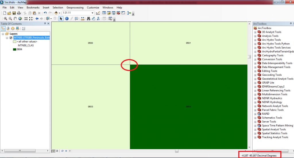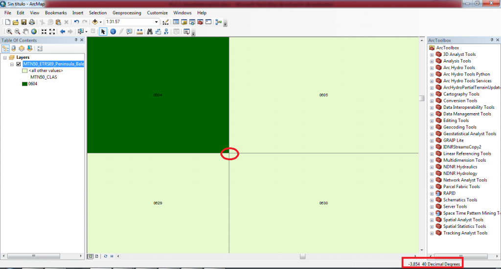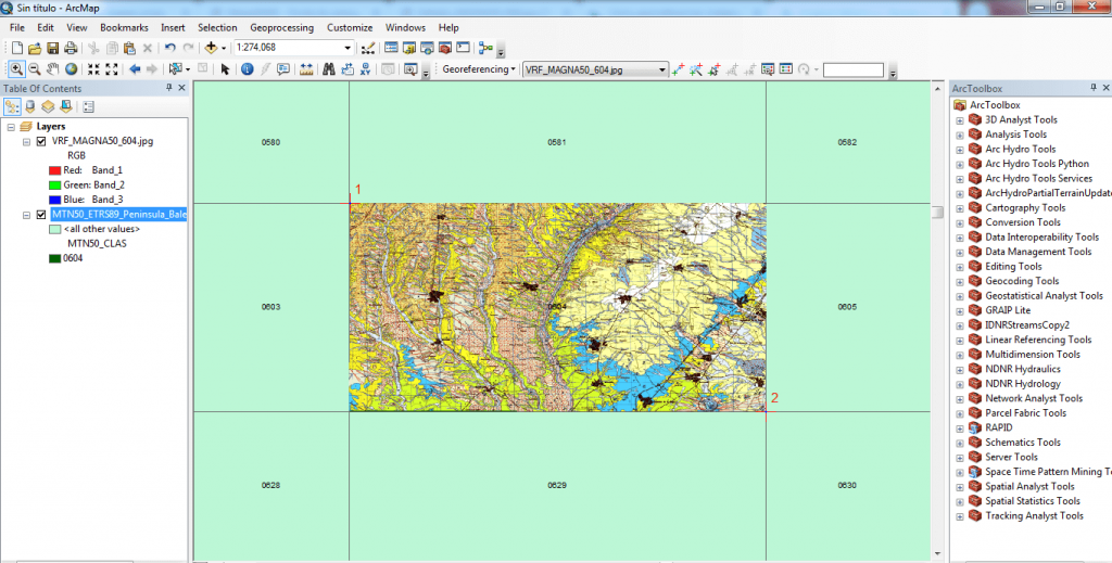 Veremos que la imagen se ubica fuera del ámbito de las cuadrículas cartográficas MTN50 por lo tanto el objetivo es ubicar la hoja del MAGNA50 604 en su cuadrícula correspondiente cuyas coordenadas son las que hemos anotado.