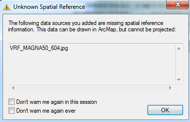 Una vez que conocemos las coordenadas de los puntos de control, cargamos en nuestro proyecto la imagen del MAGNA de la hoja 604. Al hacerlo el programa nos mostrará un mensaje de que el archivo que estamos incorporando no tiene asignada ninguna referencia espacial: