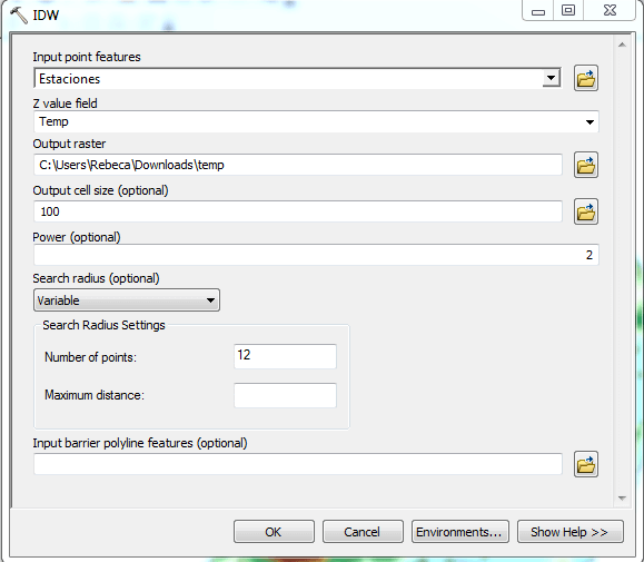 Comenzamos con la temperatura. Seleccionamos la capa que contiene las estaciones como puntos de entrada y como ‘Z_value_field’ debemos indicar el campo de la tabla de atributos que queremos interpolar (en este caso el campo “Temp”). Para este estudio nosotros vamos a dejar los valores potencia y radio de búsqueda que aparecen por defecto (Potencia ‘Power’ = 2, radio de búsqueda ‘Search radius’ = Variable y puntos a considerar ‘Number of Points’ = 12). Además vamos a trabajar con un tamaño de celda de 100 metros (‘Output cell size’ = 100).