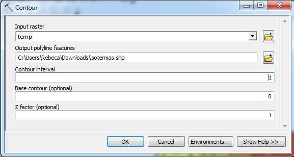 Para ello abrimos la herramienta Countour que se encuentra disponible en la caja de herramientas de análisis espacial: ArcToolbox < Spatial Analyst Tools < Surface < Contour. Como ‘Input raster’ seleccionamos el raster del que vamos a obtener las isolíneas (en este caso la temperatura) y le damos un nombre a la capa que se va a generar (‘Output polyline features’). Después debemos indicar el intervalo o distancia entre las líneas que queremos obtener (‘Contour interval’). Nosotros vamos a indicar 1 metro.