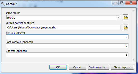 Abrimos de nuevo la herramienta ArcToolbox < Spatial Analyst Tools < Surface < Contour. Como ‘Input raster’ seleccionamos el raster del que vamos a obtener las isolíneas (en este caso la precipitación) y le damos un nombre a la capa que se va a generar (‘Output polyline features’). Después debemos indicar el intervalo o distancia entre las líneas que queremos obtener (‘Contour interval’). Nosotros vamos a indicar 5 metros.