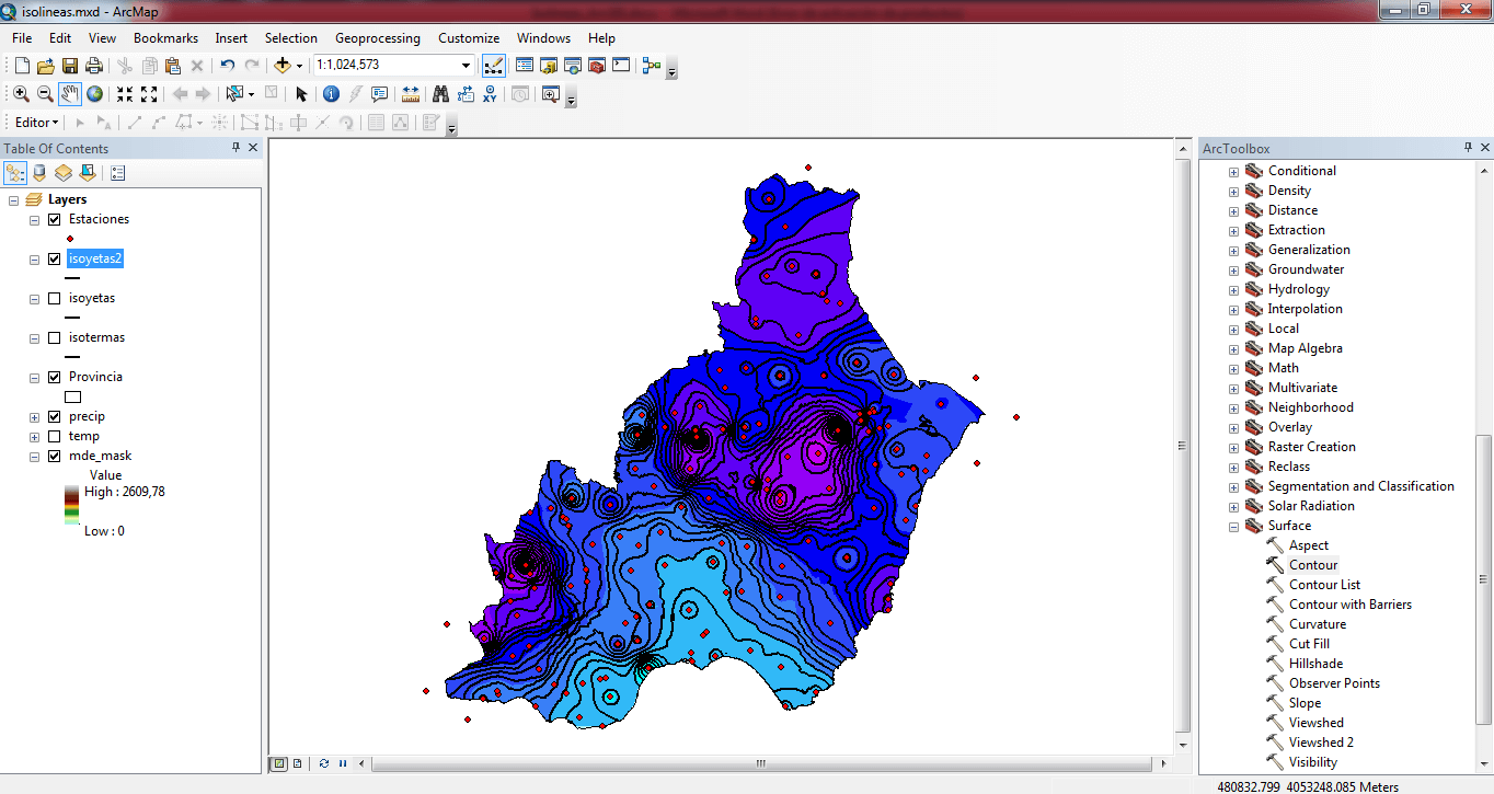ArcGIS permite obtener isolíneas de diferentes variables. Una isolínea, para una función de varias variables, es una curva que conecta los puntos en que la función tiene un mismo valor constante. Las isolíneas que se representan en un mapa son líneas, rectas o curvas, que describen la intersección de una superficie real o hipotética con uno o más planos horizontales. La configuración de estas curvas nos dará una idea el gradiente relativo de la variable o parámetro y estimar un valor en un lugar determinado.