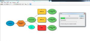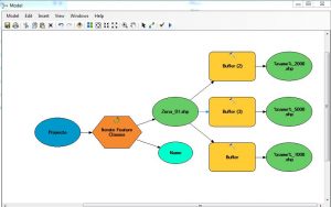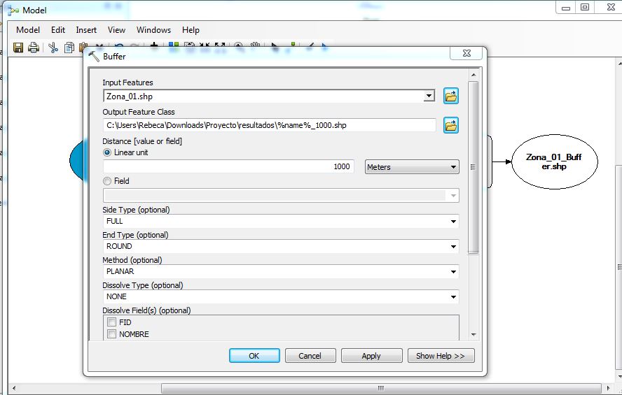 Lo siguiente que haremos será añadir la herramienta Buffer (la podemos arrastrar desde las ArcToolbox) y vincularla con la capa de salida del Iterador.