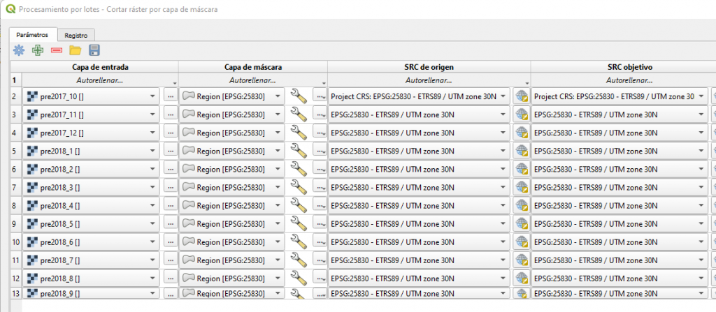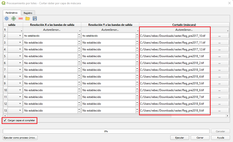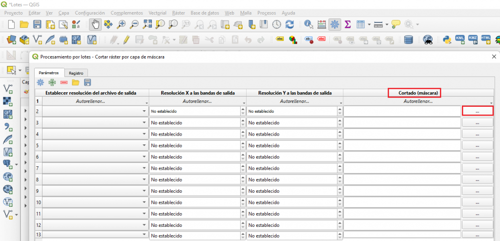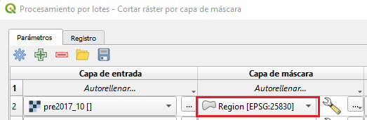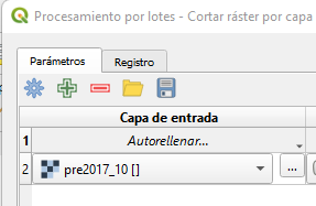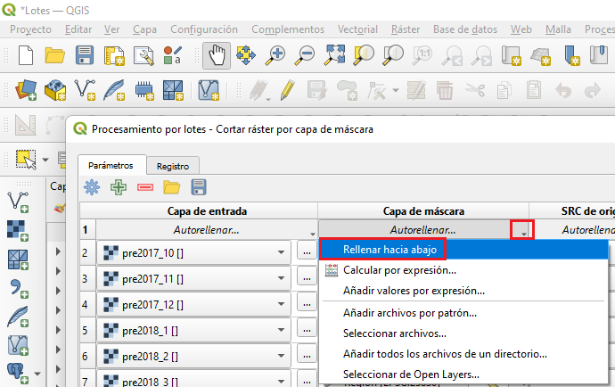 • Capa de máscara: seleccionamos la capa que usaremos de recorte. Pulsando en Autorrellenar < Rellenar hacia abajo haremos que esa misma capa se use de recorte para todos nuestros raster.