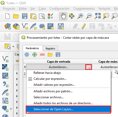 • Capa de entrada: seleccionamos uno de los raster que queremos recortar. Pulsando en Autorrellenar < Seleccionar de Open Layers se desplegarán todos los archivos disponibles para que podamos seleccionarlos.