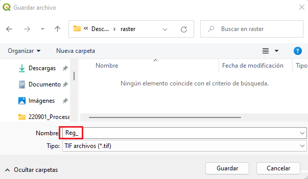 • Esto nos permite configurar la ruta de guardado y darle un nombre al archivo de salida. Nosotros vamos a indicar un prefijo para que lo ponga en el nombre del archivo de salida, seguido del nombre del raster originar, en nuestro caso escribimos «Reg_».