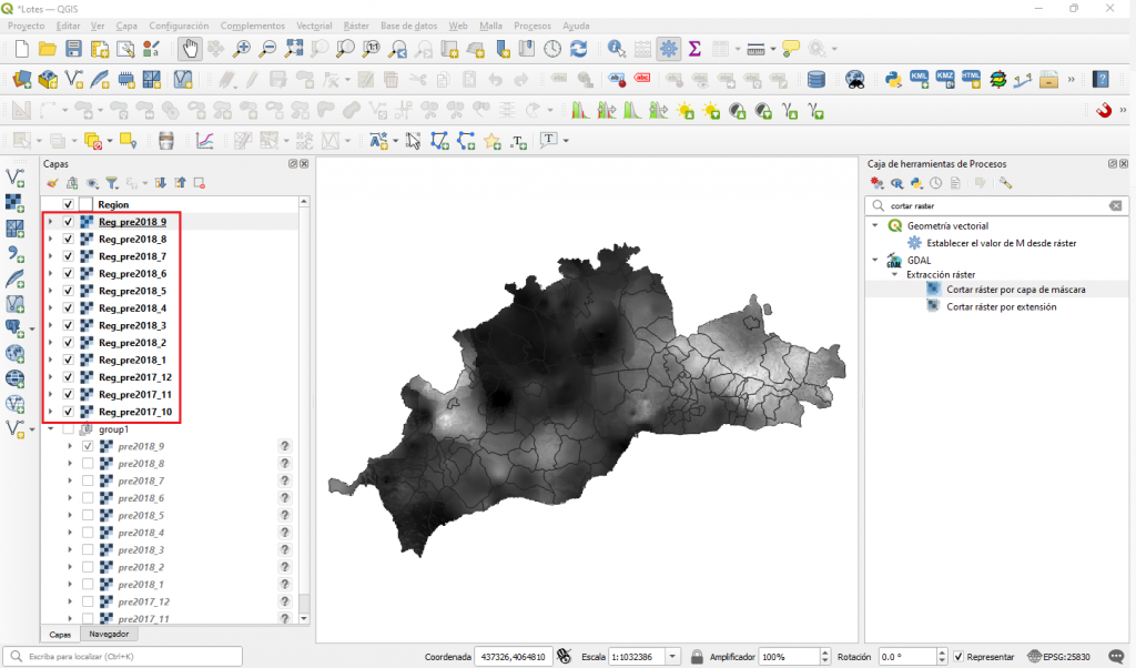 Nosotros tenemos una serie de archivos raster de precipitación de toda España y necesitamos recortarlos con una misma capa vectorial que representa nuestra zona de estudio.