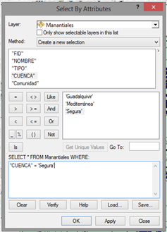 Necesitamos seleccionar todos los manantiales que pertenecen a la cuenca del Segura así que vamos a utilizar la herramienta de selección por atributos Selection < Select by Attributes: