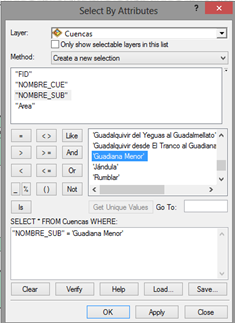 Lo primero que tendremos que hacer será escoger la capa de la cual queremos hacer la selección («Manantiales.shp»); una vez escogida haremos doble click sobre el atributo que nos interesa. En este caso queremos seleccionar todos los manantiales de la cuencas del Segura, es decir, los manantiales cuyo atributo ‘Cuenca’ sea igual a ‘Segura’. Para ello hacemos doble click sobre el atributo ‘Cuenca’ y seleccionamos el signo «=». Para que el programa nos muestre los valores que puede tomar el campo seleccionado, pulsamos sobre ‘Get Unique Values‘ y a la derecha aparecerán todos los posibles valores (Guadalquivir, Mediterránea y Segura) de manera que hacemos doble click sobre la que nos interesa.