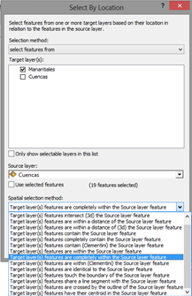 Existen muchos métodos de selección espacial; como queremos seleccionar los manantiales ubicados en la subcuenca que hemos seleccionado, elegiremos el método ‘Target layers features are completely within the source layer feature’.