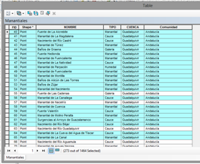 Tras pulsar en OK, aparecerán seleccionadas todas las entidades que cumplen esa condición; si abrimos la tabla de atributos vemos que se han seleccionado un total de 171 manantiales.