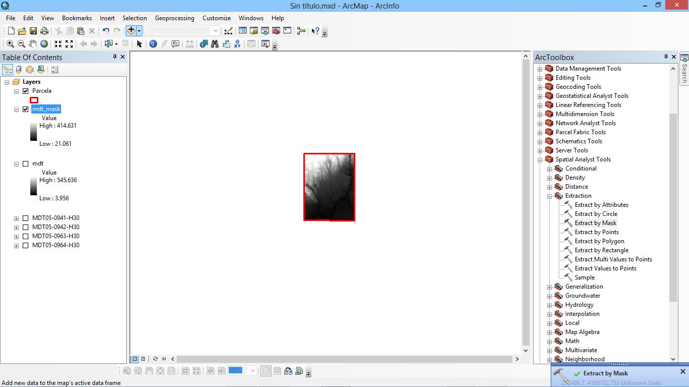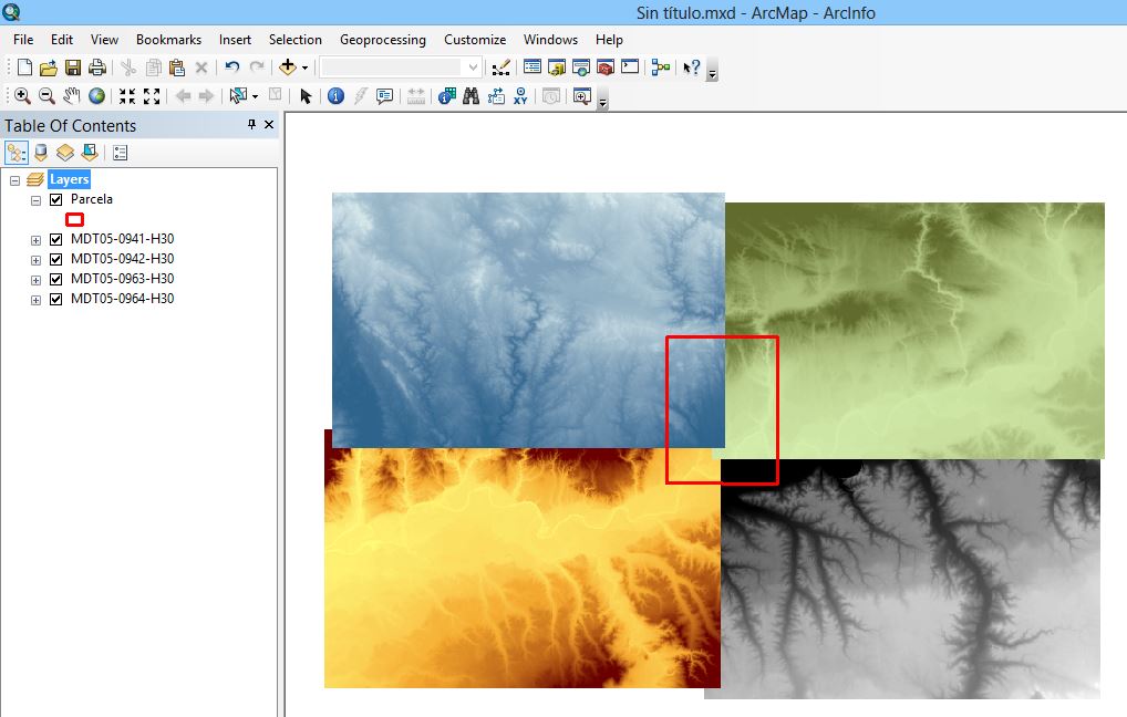 Ya hemos realizado la unión de raster con ArcGIS pero este nuevo raster ocupa una gran extensión así que vamos a «recortarlo» para quedarnos sólo con la información que está dentro de la zona que nos interesa, que se corresponde con la capa denominada «Parcela».