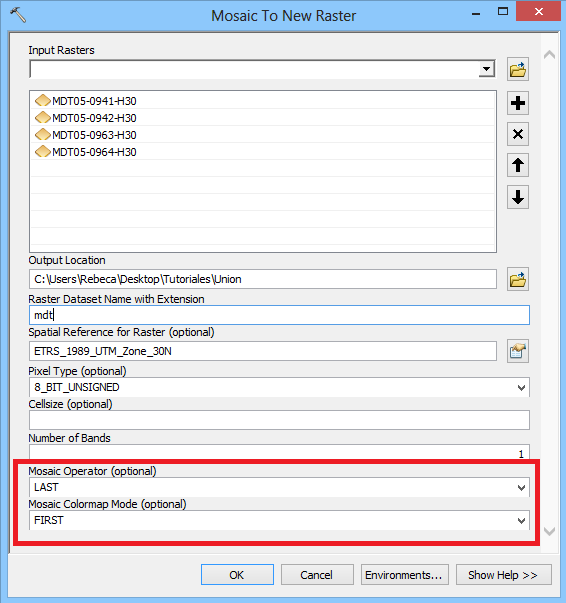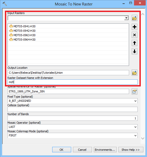 En primer lugar seleccionamos con el desplegable los raster que queremos unir (‘Input Rasters’), indicamos la carpeta donde queremos que se guarden (‘Output Location’) y le damos un nombre al archivo que se va a generar (‘Raster Dataset Name with Extension’).