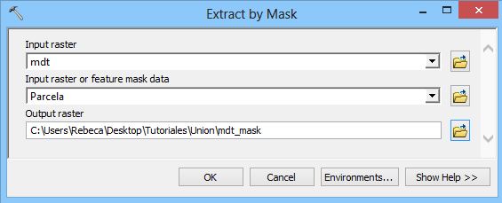 Como lo que necesitamos es recortar un raster con una capa vectorial, utilizamos la herramienta de «Extracción por máscara» En este caso simplemente tendremos que indicar cuál es el raster que queremos recortar (‘Input raster’), la capa que utilizaremos como recorte/máscara (‘Input raster or feature mask data’) y asignaremos una ruta de guardado y un nombre a raster de salida (‘Output raster’).