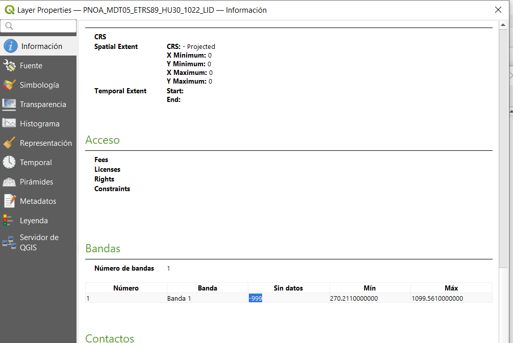 Posteriormente indicamos el tipo de dato de salida, que será «Float32«. Luego tendremos que indicar el valor que asignan las capas originales a las celdas sin dato. Si no lo conocemos podemos consultarlo pulsando en uno de los MDT con el botón derecho < Propiedades < Informacion. En este caso veremos que el valor de las celdas sin dato es -999.