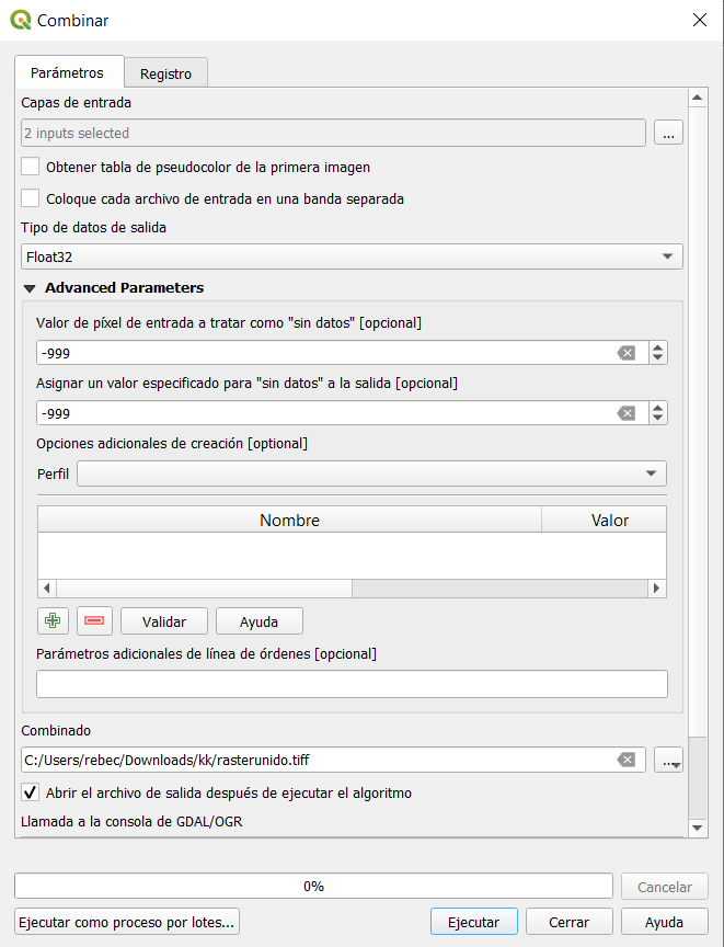Una vez que lo hemos configurado en función de nuestras necesidades, pulsamos en Ejecutar y obtenemos un nuevo raster, resultado de la unión de los 2 raster originales: