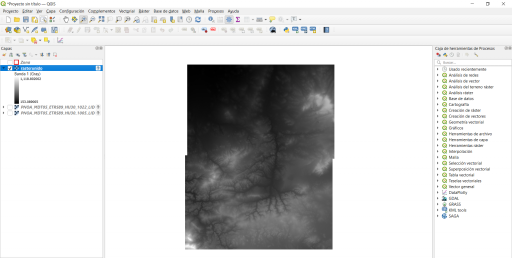 Al trabajar con información raster, cuando realizamos estudios del territorio es muy probable que la zona que vamos a analizar se encuentre repartida en varios archivos; esto es bastante común por ejemplo cuando trabajamos con Modelos Digitales del Terreno (MDT) que nos descargamos de páginas de organismos oficiales (p.e. Centro Nacional de Información Geográfica – CNIG). Por suerte, podemos realizar la unión de raster con QGIS y su recorte mediante dos de sus herramientas.
