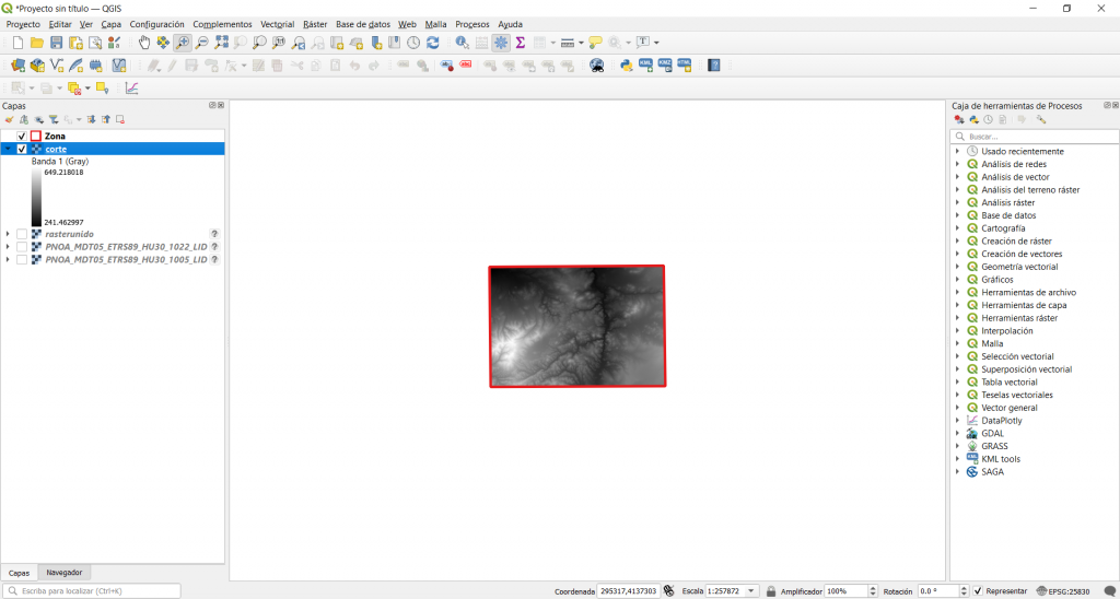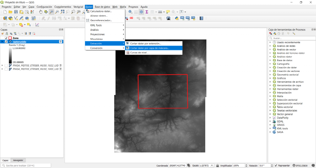 Ya hemos realizado la unión de raster con QGIS pero este nuevo raster ocupa una gran extensión así que vamos a «recortarlo» para quedarnos sólo con la información que está dentro de la zona que nos interesa, que se corresponde con la capa denominada «Zona».